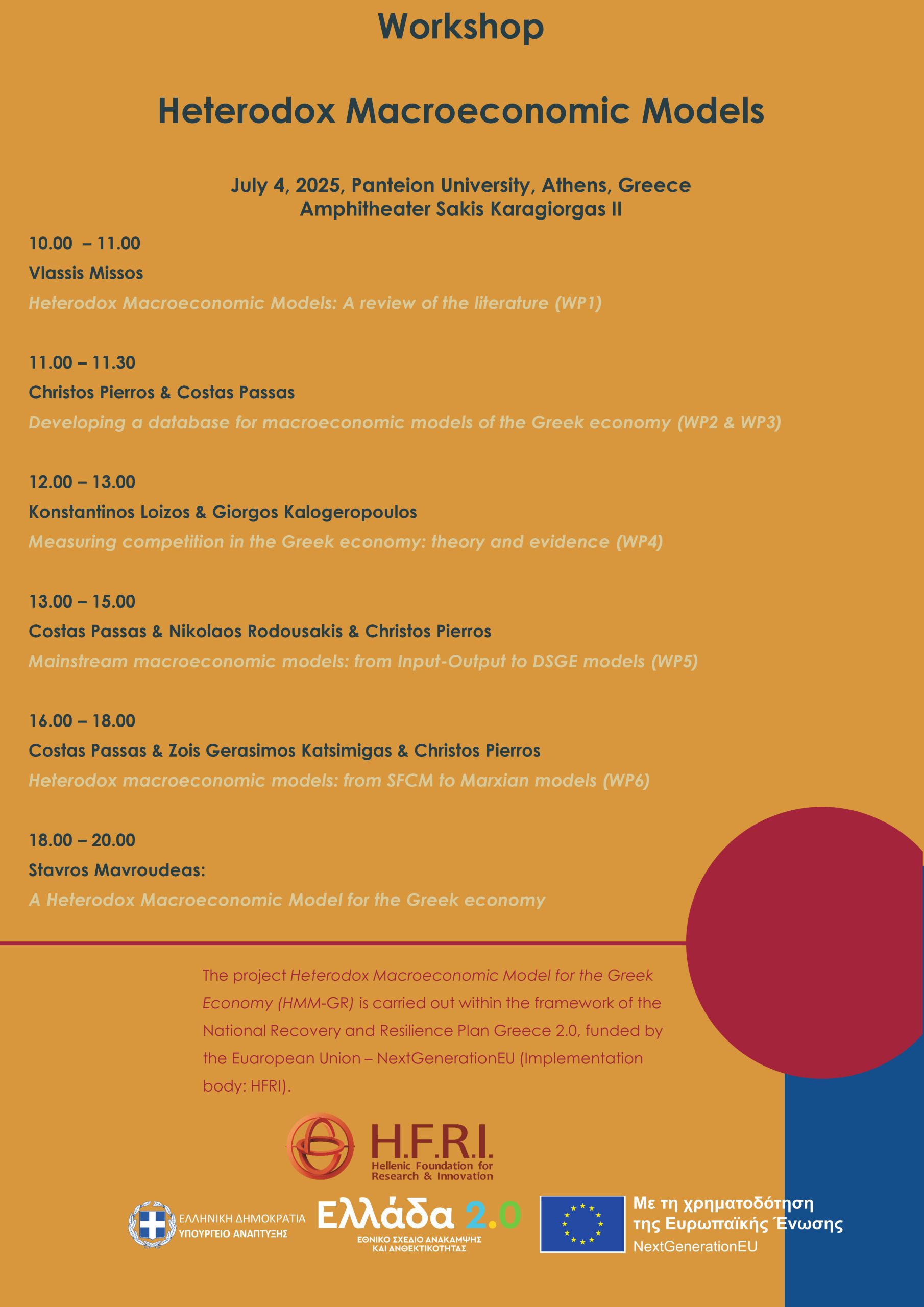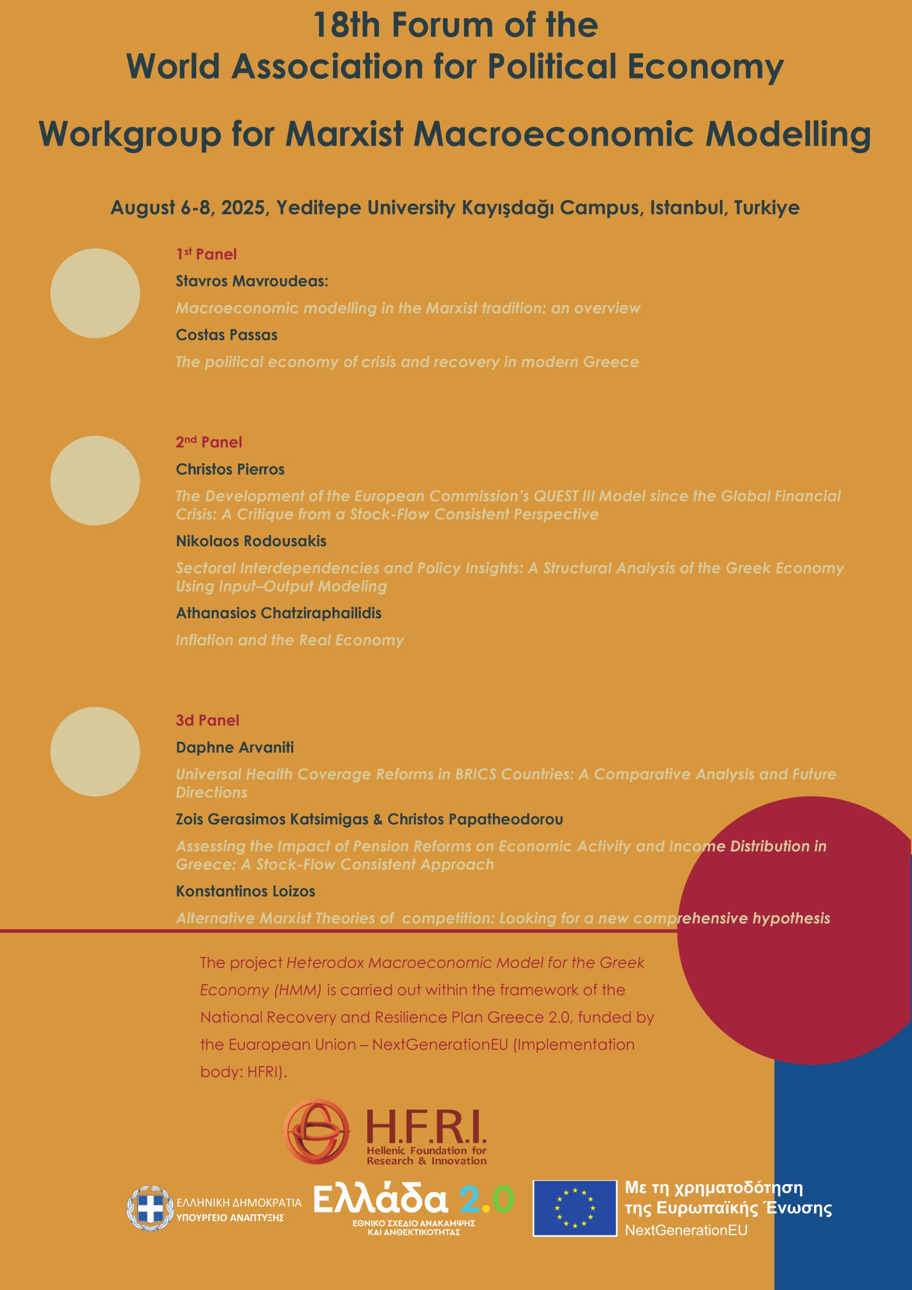 Dissemination The results of HMM-GR have been disseminated in the following workshops and international conferences:Workshop on Heterodox Macroeconomic Models. Panteion University, 4 July 2025. 18th Forum of the World Association of Political Economy, August 6-8, 2025, Yeditepe University Kayışdağı Campus, Istanbul, Turkiye